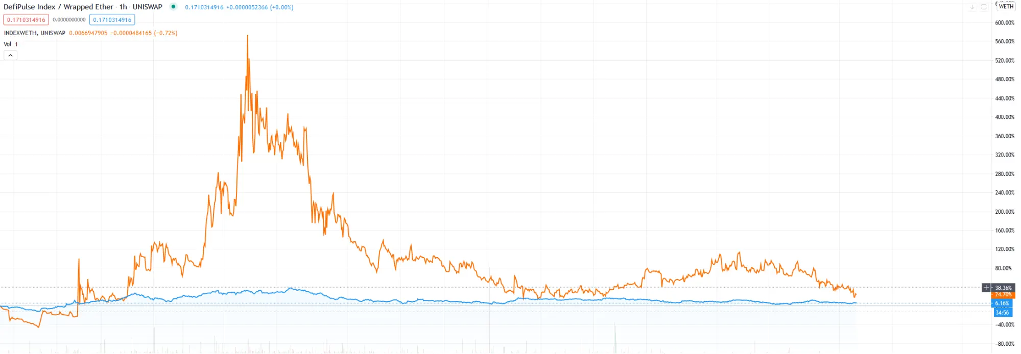 Chart from Tradingview that compares the two assets pairs, INDEX/ETH and DPI/ETH
