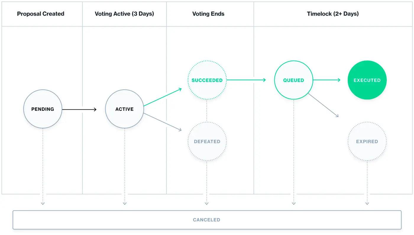 - Once a proposal has passed, it must be queued on-chain. This action can be triggered by anyone who is willing to pay the gas fee (usually done by a DAO member). The proposal then enters a holding period of 48 hours to allow users time to prepare for the consequences of the execution of the proposal. After the holding period, the proposal’s execution can be triggered by anyone within 14 days. If the proposal is not executed within 14 days, it will expire and is no longer actionable.