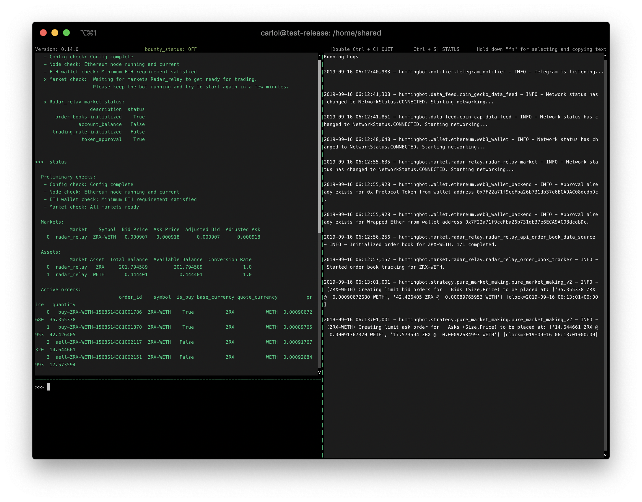 As a company, we made a strategic decision to start working on Hummingbot full time in December 2018. We released the first closed alpha version of the product in March 2019 and open-sourced the bot in April. We were able to set up the infrastructure for and launch the first liquidity bounty program in July.