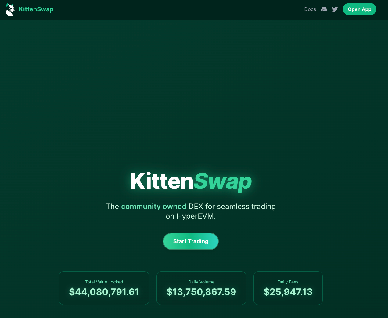 Overview: KittenSwap is a decentralized exchange (DEX) built on HyperEVM, launched in December 2024, and designed as a fork of Velodrome. It implements the innovative ve(3,3) tokenomics model, combining automated market maker (AMM) efficiency with a governance and reward system that aligns the interests of liquidity providers, token holders, and protocol developers.