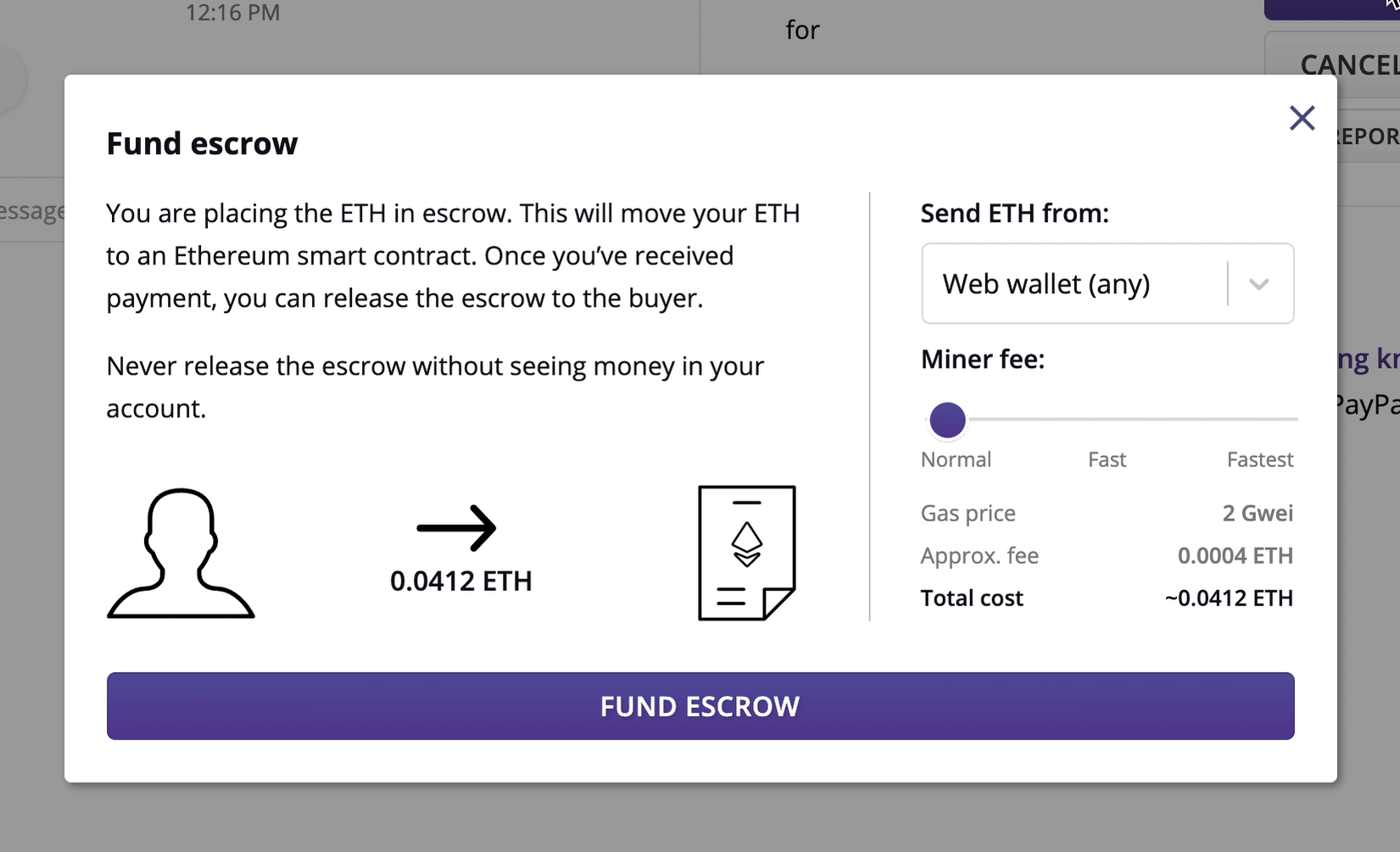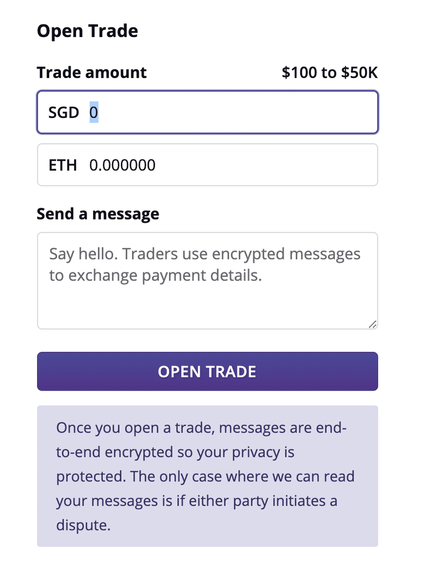 A peer-to-peer exchange is a different experience to using a traditional centralized exchange. To complete a peer-to-peer exchange, the seller first puts the ETH side into an escrow account. Once the ETH is in escrow, the pair discusses payment details over end-to-end encrypted chat. The buyer then pays the seller through the agreed-upon means, and afterwards the seller releases the ETH from escrow.