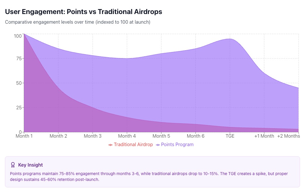 Vesting schedules align recipients with long-term protocol success by preventing immediate exits. Jupiter’s gradual token release helped stabilize post-TGE prices and maintain user engagement. Ongoing points programs post-token—using actual tokens rather than points—maintain engagement loops indefinitely.