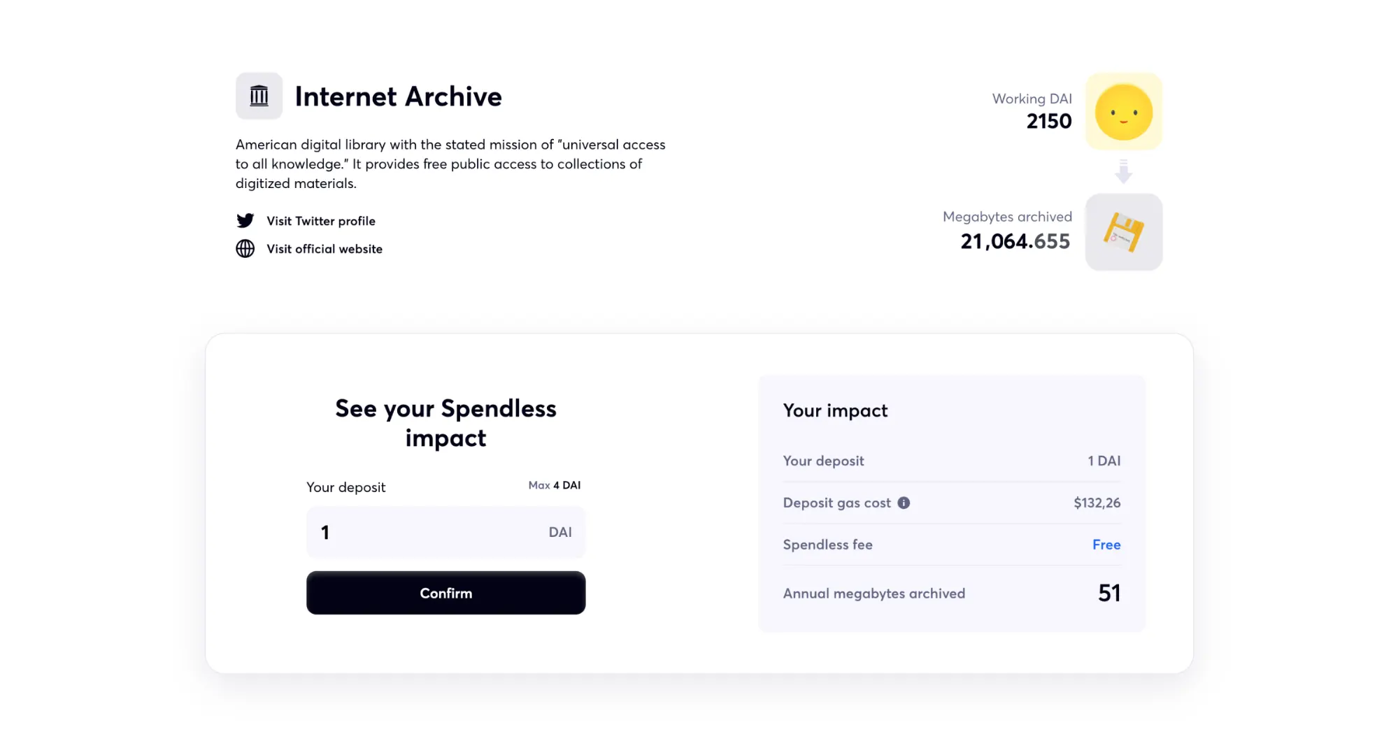Spendless is an app to donate money without spending it. It works by depositing users’ DAI into Compound Finance to earn interest and then redirecting only the interest to a charitable campaign. Spendless shows users the continuously increasing impact that their funds are generating in the metric that matters most, like the number of trees planted or the number of megabytes archived from the user’s redirected interest.