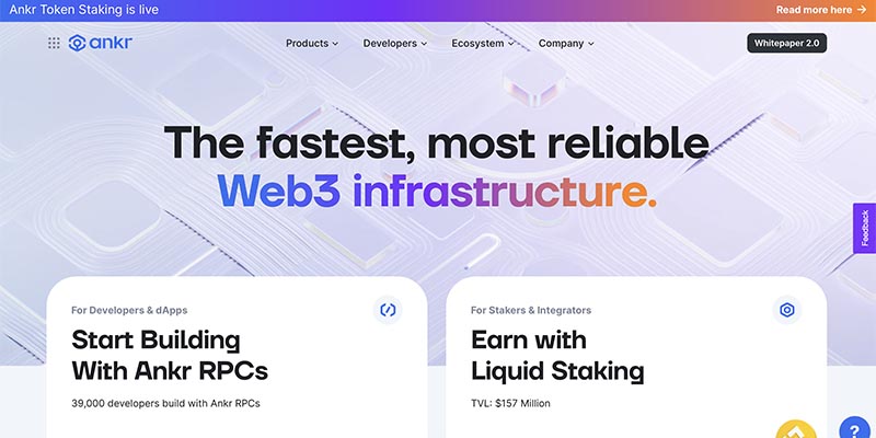Ankr is a Web3 infrastructure provider that operates an array of globally-distributed nodes serving 50 blockchain networks and RPC services to 18+ blockchains.